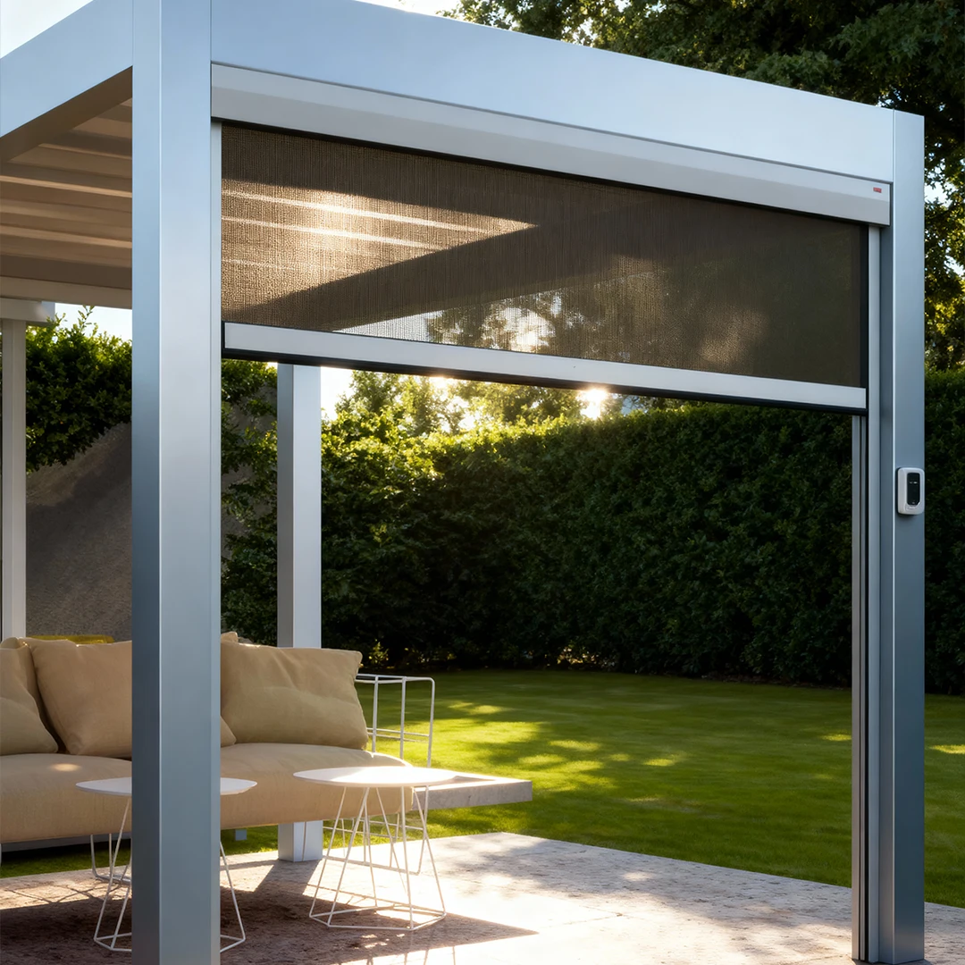 - Motorización: Son compatibles con accionamiento por motor o cardán, facilitando un manejo fácil y sin esfuerzo. Opcionalmente, el anemómetro Somfy permite la recogida automática de la mosquitera ante viento fuerte, lo que minimiza el riesgo de deterioro y protege su inversión.